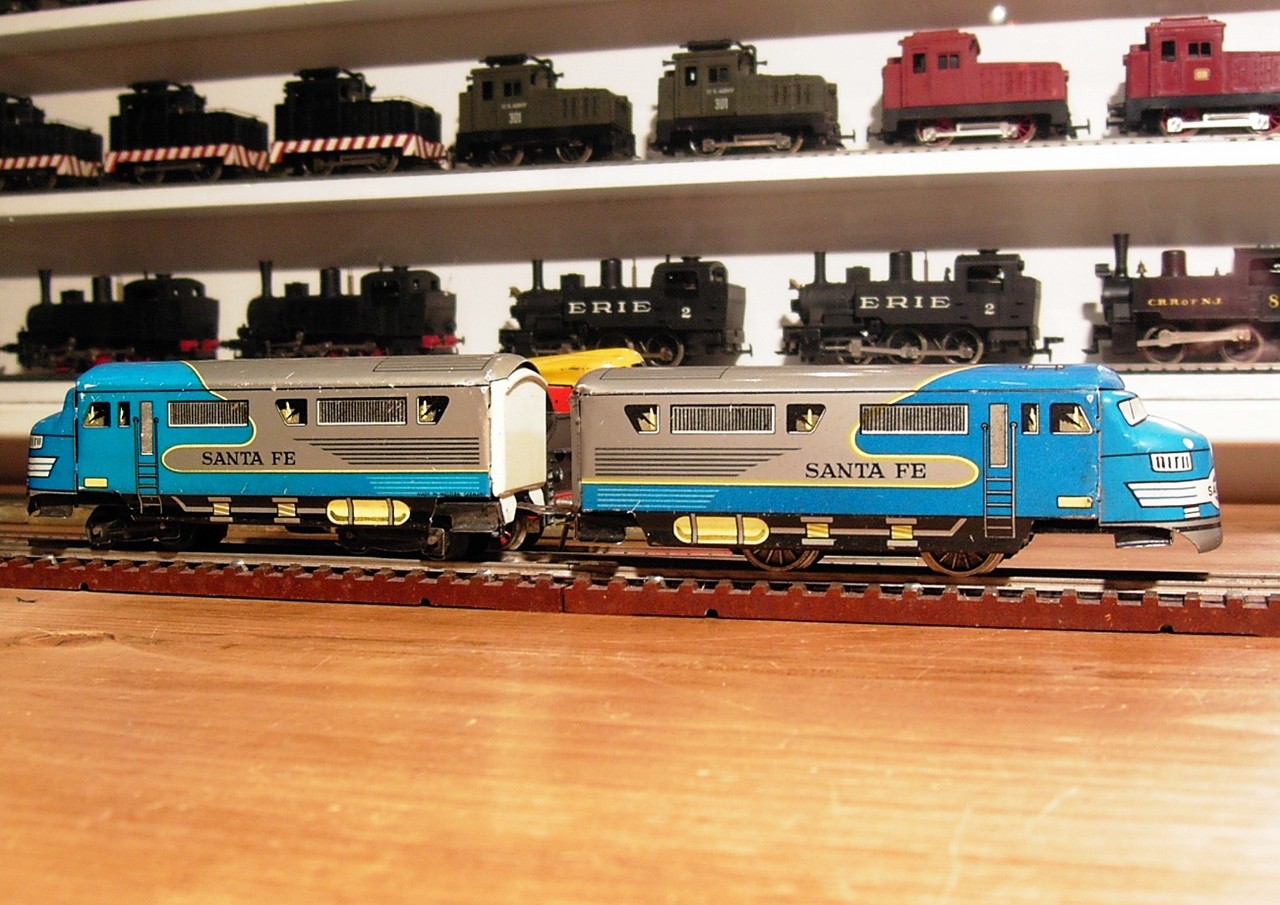 … .In the showcase of German tin toy trains I chosed this rare pair of diesel locomotives “Santa Fe” of the 50s by Groetsch …. (Yeah, not everyone is called Bianchi, Rossi or Schmidt). ….